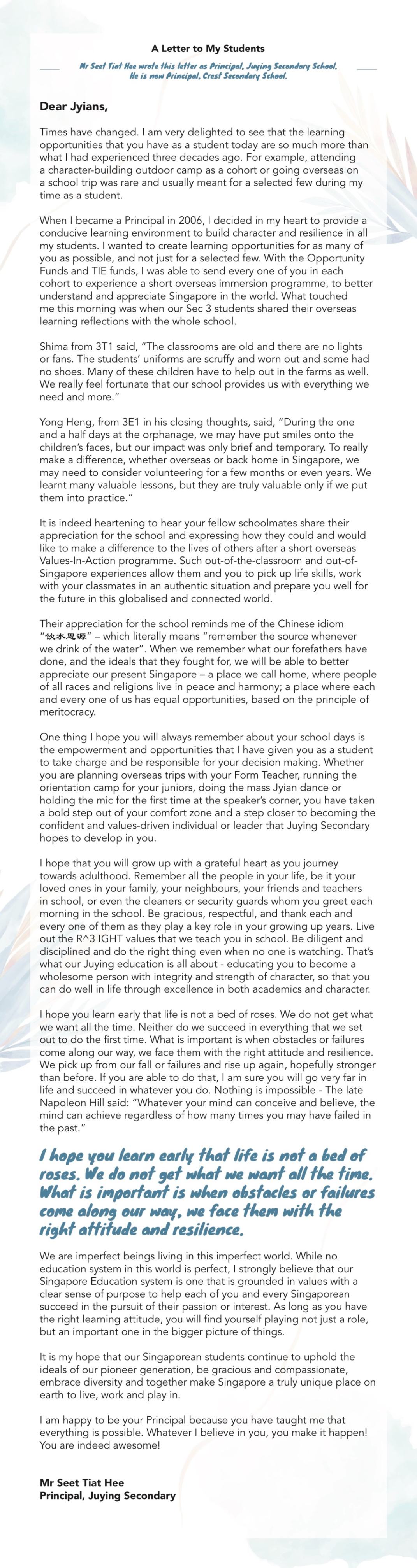 What do Principals and teachers hope for their students? Mr Seet Tiat Hee, Principal, Crest Secondary, talks about the importance of out-of-classroom experiences that teach students so much about the world and themselves.