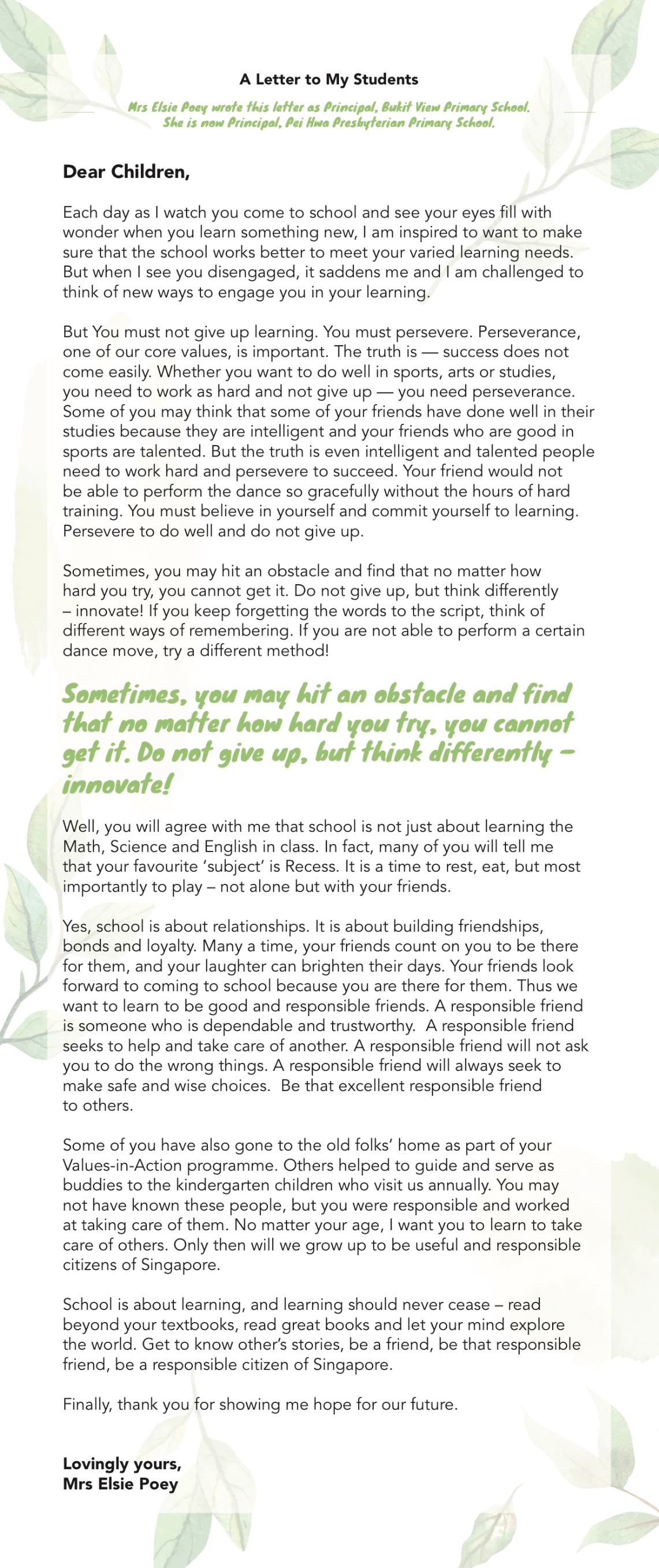 What do Principals and teachers hope for their students? When students say their favourite subject is “recess”, Mrs Elsie Poey, Principal of Pei Hwa Presbyterian Primary, is not upset. After all, school is not just about lessons, but also about relationships, she says.