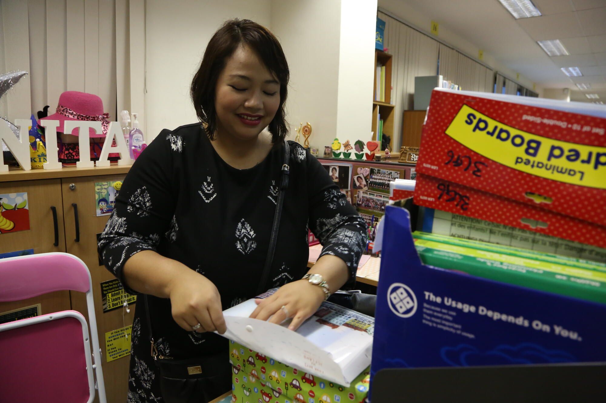In her cozy corner, surrounded by photos of students who have passed through her hands, Mdm Nita prepares materials for her new Primary 3 class.