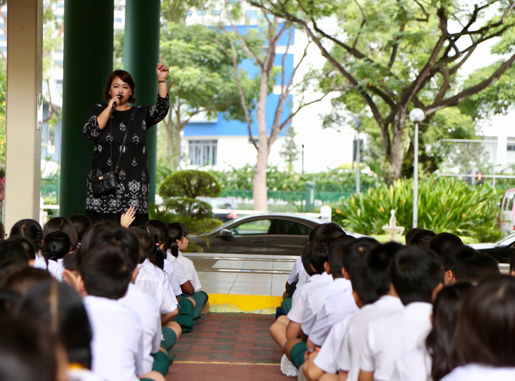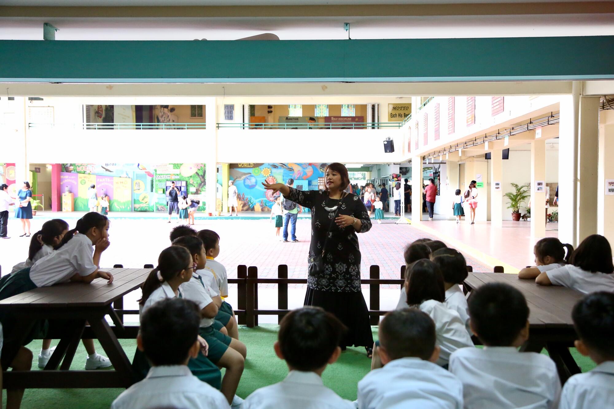 Learning takes place both in and out of the classroom! Mdm Nita introduces her students to the Reading Nook – an area where students can pick up story books for the silent reading period before morning assembly.