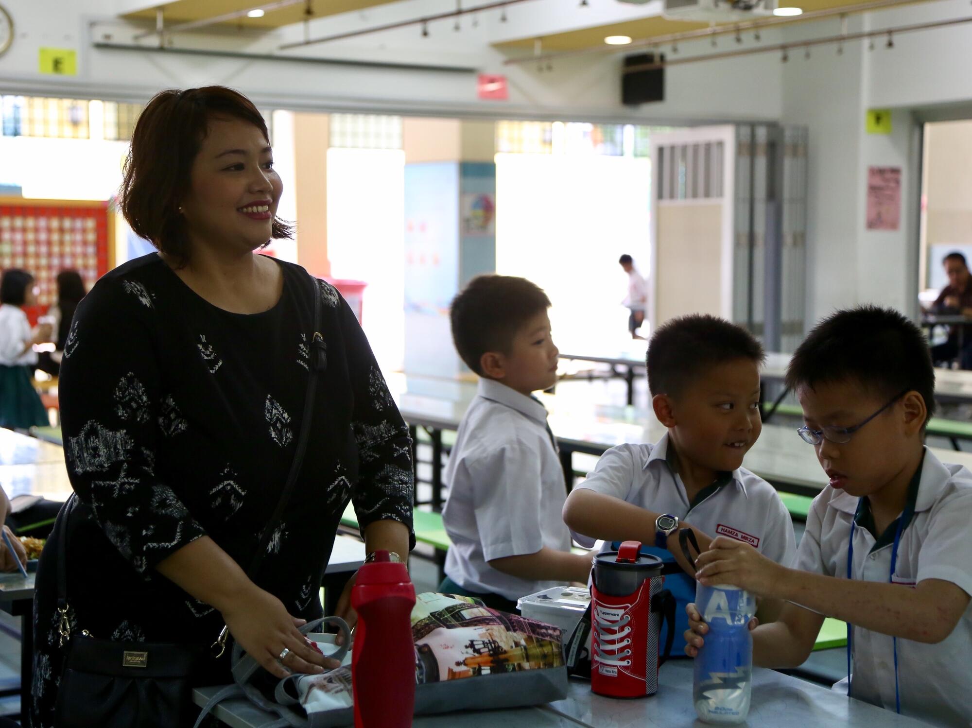 Hurrah for recess! Those who eat together, stay together. Mdm Nita sits down to eat with her students.