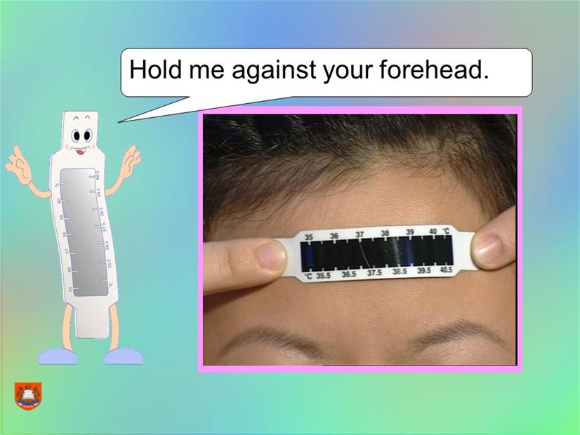 A slide from the SARS learning package showing students how to use the forehead thermometer. Photo credit: Curriculum Planning and Development Division, MOE.