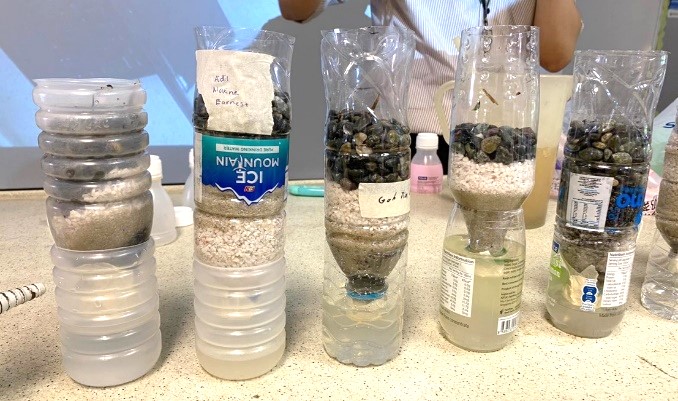 For example, students know about the principle of filtration from Science, but we want them to gain a deeper understanding of why different materials are needed to produce clean water. Instead of giving them the answers, we got them to conduct their own experiments to layer the materials(e.g. pebbles, gravel and sand) in different order and observe the results for themselves.