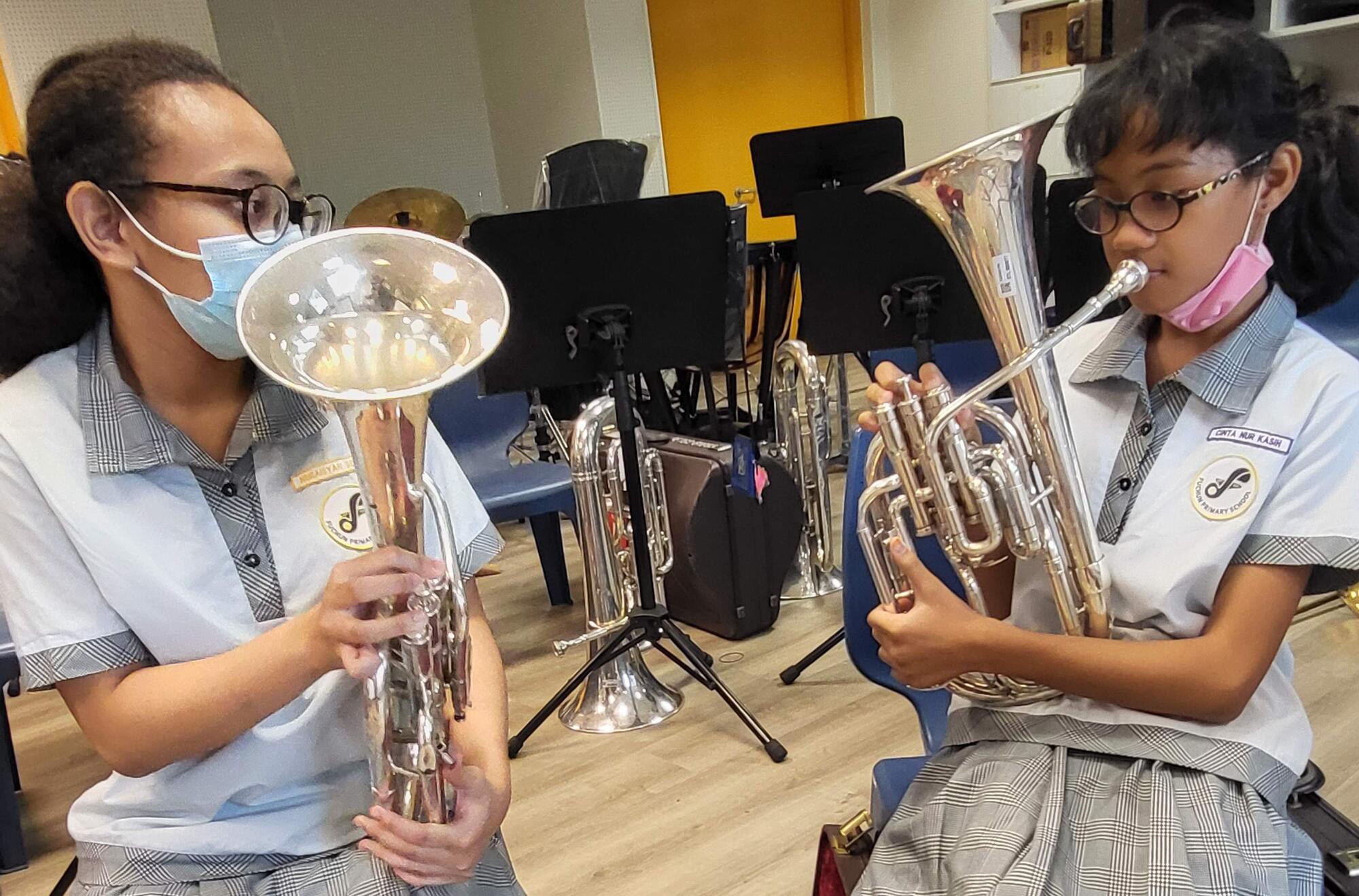 Primary 6 student Nuraisyah Sofea (left) practising the tenor horn with Cinta Nur Kasih, who is in Primary 4.
