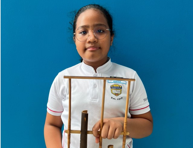 Nur Nisa Shafiqa, a Primary 3 student from Guangyang Primary School, with the ‘C’ note angklung.