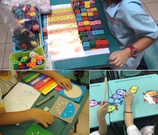 (Clockwise): Students learning counting, addition and fractions using various manipulatives, games and fun.