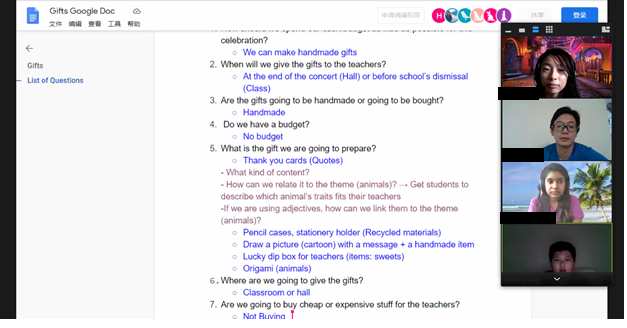 In the next session, the student leaders divided themselves into teams to work on the games, gifts and performances for the event. We showed them how to use the ‘Breakout rooms’ function on the online platform to facilitate their discussions. To help everybody keep track of the discussion, the students were also taught to write minutes of their meetings using Google Docs.