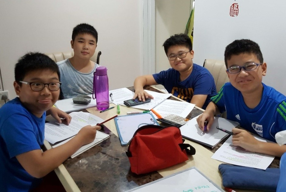 (From left to right) Tony, Pin Quan, Javier and Chien Kiat brushing up on their Maths skills in preparation for the PSLE.
