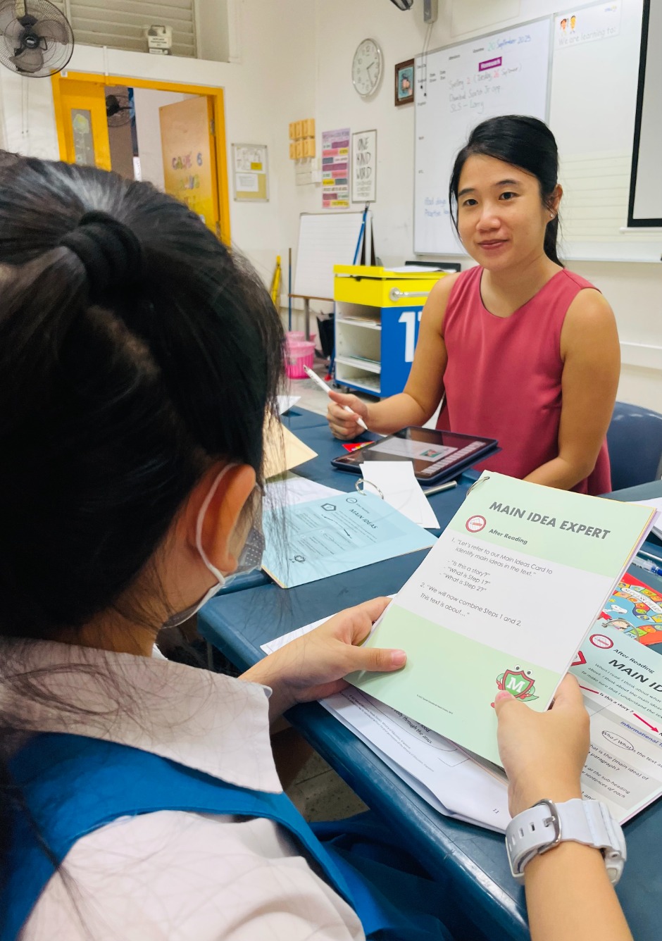 After school, Mrs Ng used tools such as interactive posters and student cards to guide Shermaine to read. They illustrated how to apply reading strategies step-by-step, which Shermaine diligently referred to while she practised reading.