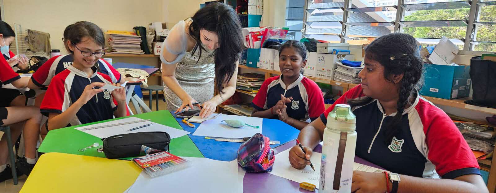 Ms Wang Yihan, a PSG member and contemporary artist guiding students to create 3D drawings during her engagement session.