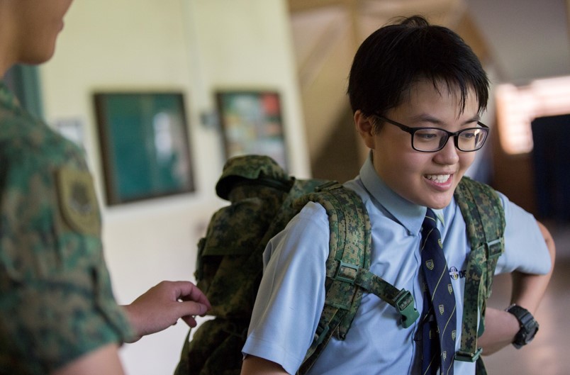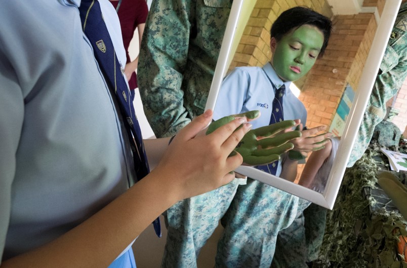 Putting her game face on, En Sha, a secondary three student at Deyi Secondary School, tries camouflage paint.