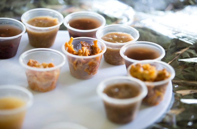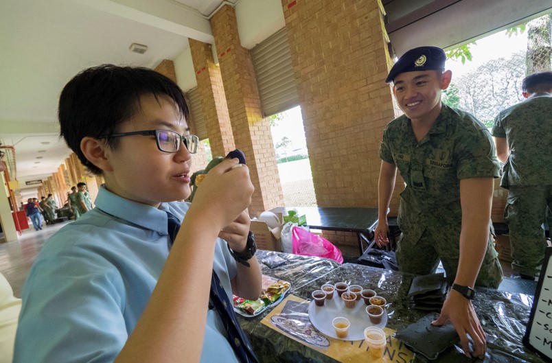 The field rations provide 3,350 Kcal for soldiers who undergo vigourous training.Unlike how they would usually consume rations outfield, the soldiers specially warmed up the food and served it in small tasting cups for the students.