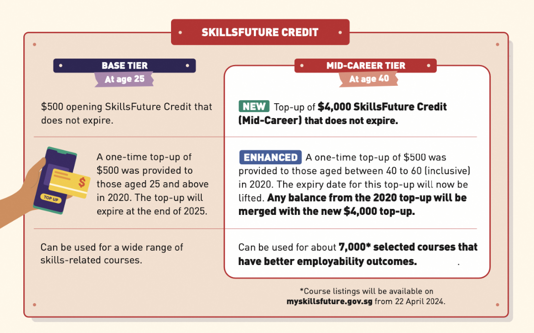 - From 1 May 2024: Singaporeans aged 40 and above will receive a SkillsFuture Credit (Mid-Career) top-up of $4,000, which does not expire.
