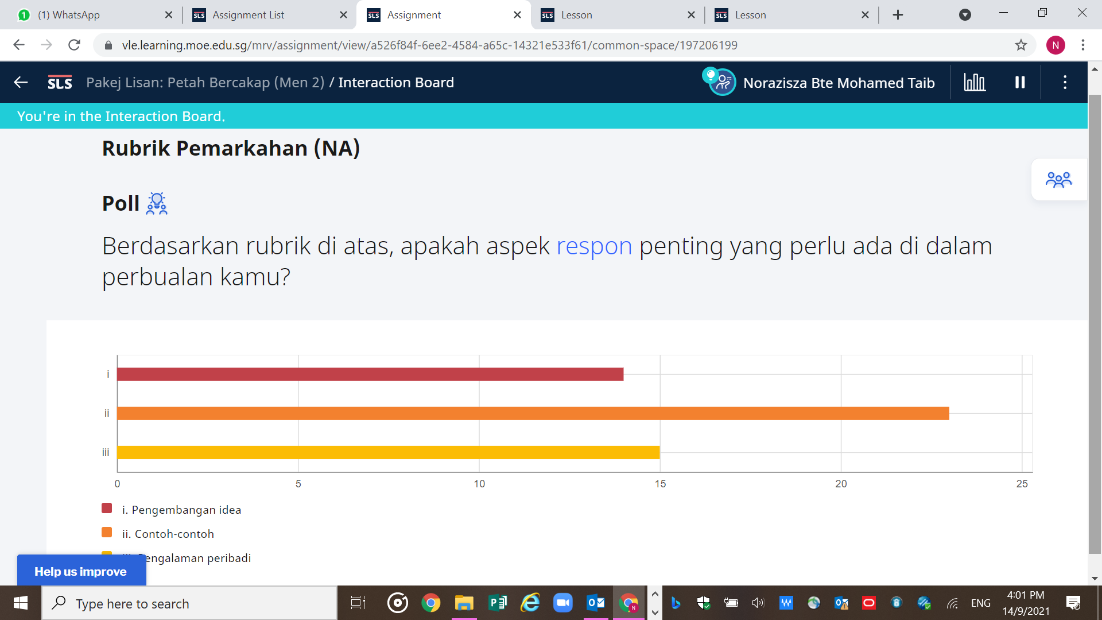 From students’ responses through the poll in SLS, Mdm Norazisza’s students use the marking rubrics to self-assess their progress.