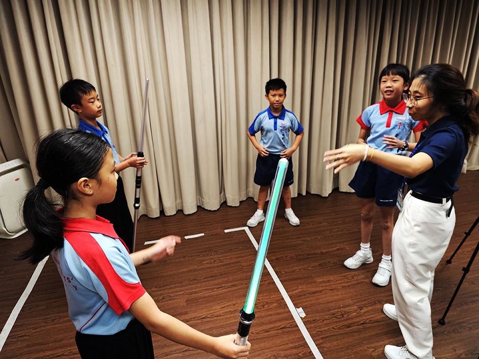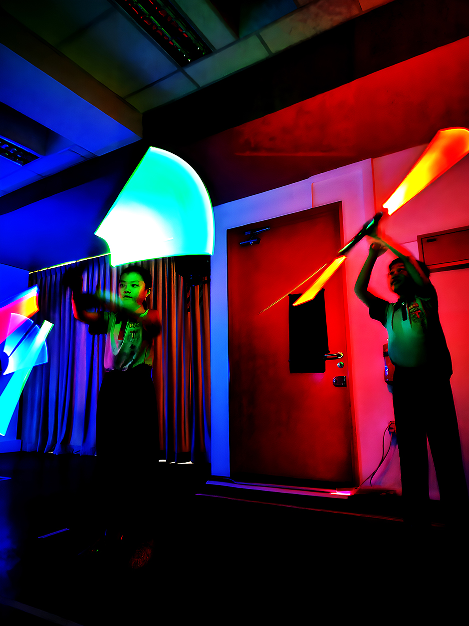 Wushu members raise their light sabres, painting neon arcs and dazzling swirls. With cameras set up by our Infocomm Club, we work to capture every kick and spin, guided by teachers, seniors and friends.