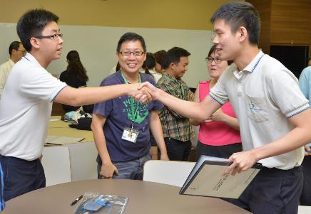 Mr Jack Lim Tian Hwa (middle) looks on as Seah Guan Yi (right) is congratulated by fellow Pathlighter at the 2014 GCE ‘O’ level results release (Photo taken before COVID-19)