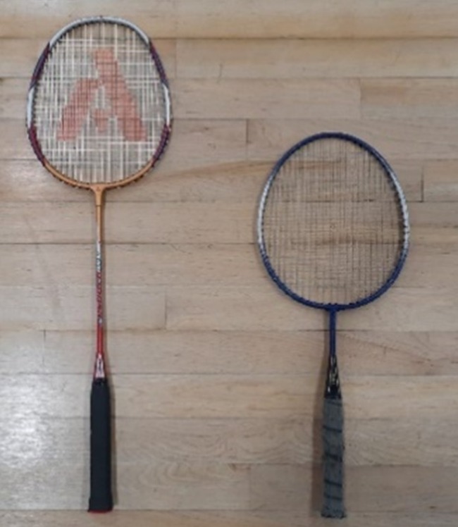 A normal badminton racquet (left) vs a shorter badminton racket (right) for wheelchair users.