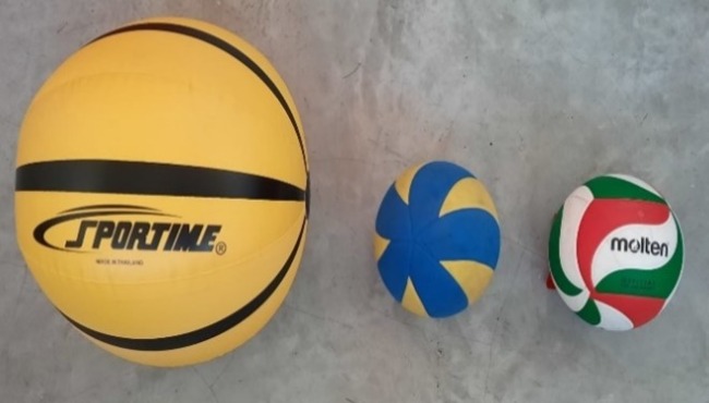 The large foam beach ball (left) is used to help wheelchair users play Volleyball. The blue and yellow ball (centre), which is padded, is for students learning to serve or hit. The impact is less painful compared to the normal volleyball (right).