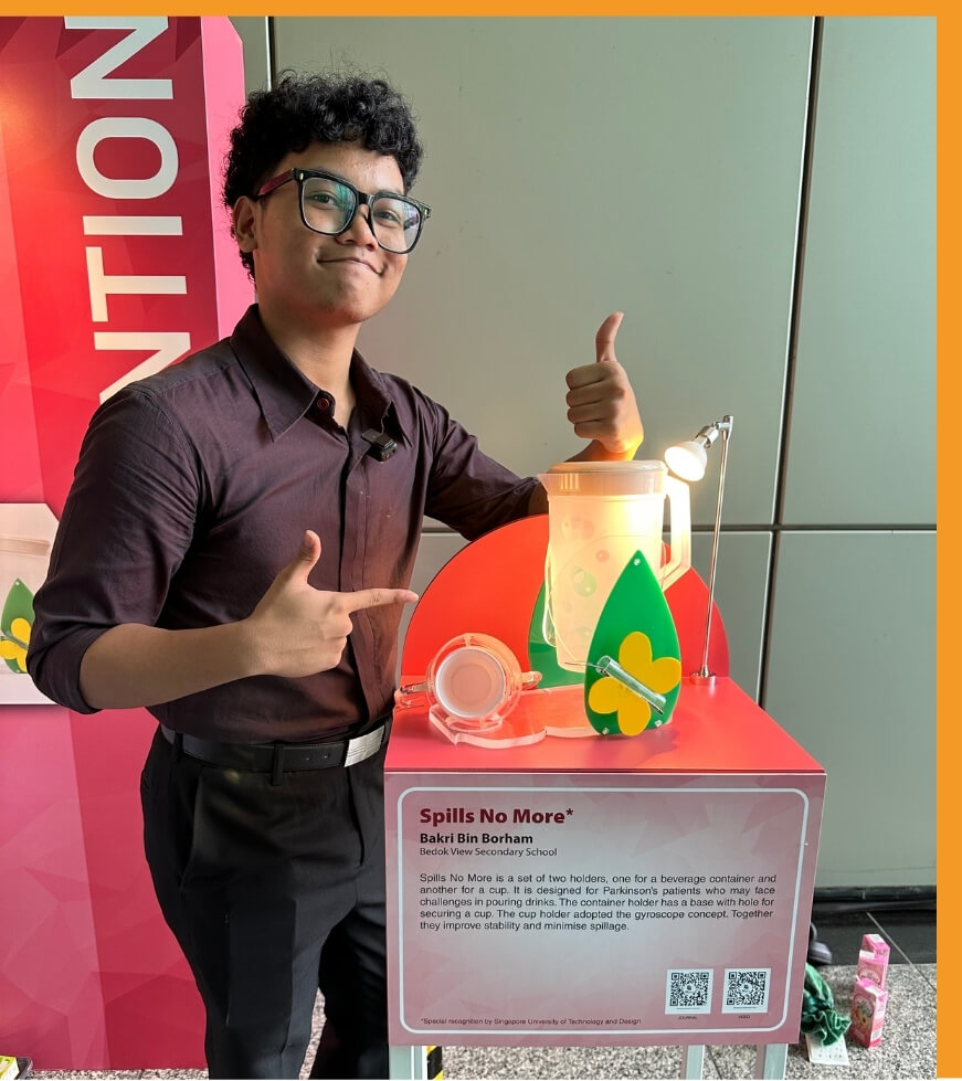Bakri Bin Borham from Bedok View Secondary School borrowed the principles of a gyroscope for his invention of a spill-proof jug.