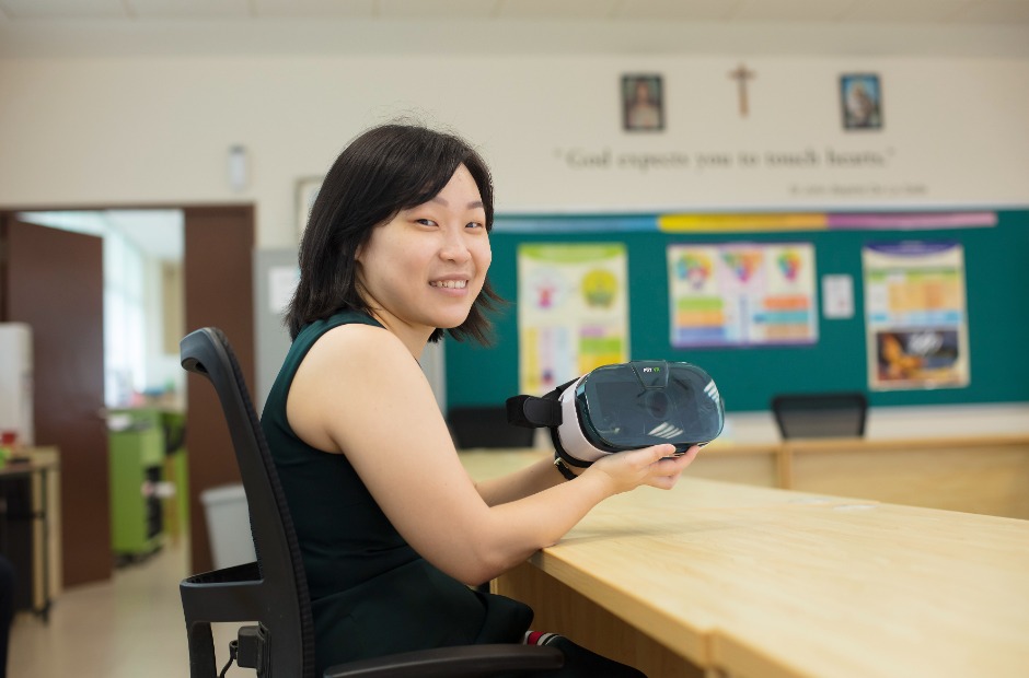 Ms Tan with a virtual reality headset used for watching 360 videos.