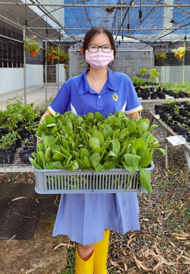 A bountiful harvest from the school’s garden! This is what Pei Yi gathered for the day’s use. Students can cook the veggies during Food and Consumer Education lessons, or give them to the canteen vendors for their dishes.