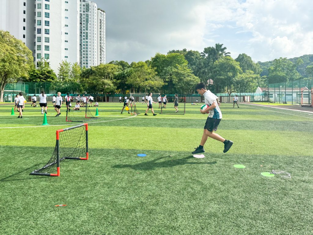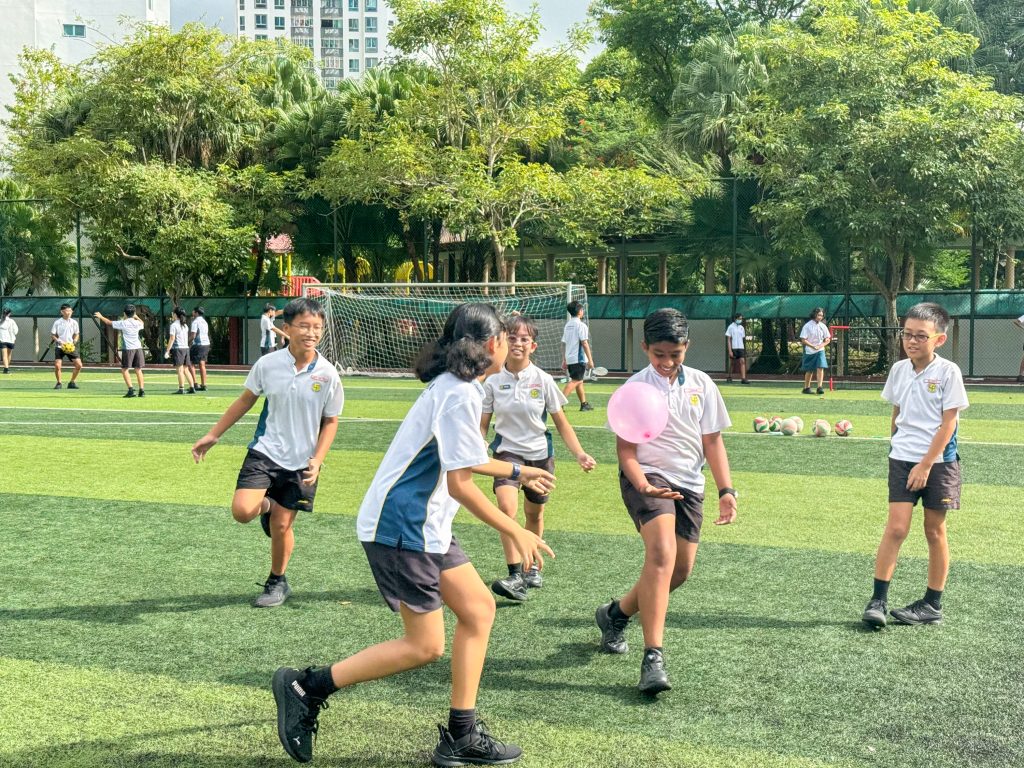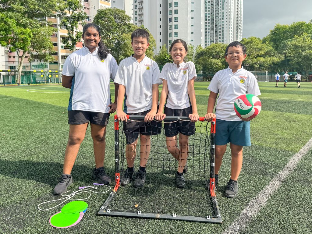 The Primary 6 students visited the Enabling Village to learn about prosthetics and the importance of inclusivity, and were tasked with inventing new games to ensure a more inclusive play experience in school for their Primary 1 juniors. Students Mudaliar Mishti, Liu Ji, Kuan Jing Ling and Nyan Linn Htet had conversations with their Primary 1 friends and observed the kinds of games they played during recess. They found that while the Primary 1s enjoy games like football, they do not actively play it during recess as they are intimidated by the older students who are much better than them. They thus came up with “The Polysport Race”, which combines hopscotch and football and is designed for the Primary 1s to score goals more easily.