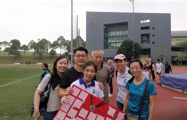 Leyin with her family and supporters at the Singapore Sports School Para Games 2019. In her hands, a board full of well-wishes from her classmates. Mdm Lee Lin Yee, immediate past Principal of St Margaret’s Secondary School (rightmost), along with Mrs Christine Ho (second from right), were also there to cheer for Leyin.