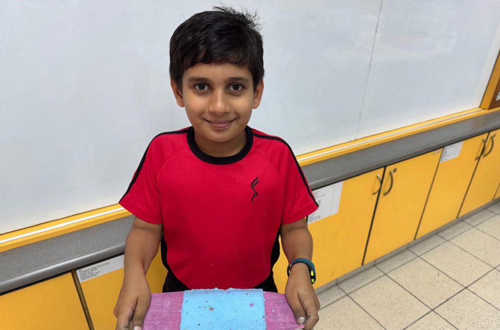 “We shred these papers before turning them into pulp by blending the paper with water,” explains Primary 5 student Ishaan Kaustubh. “Then we collect fallen leaves and flowers from the school’s garden, tear them into small pieces, and mix them with seeds and water.”