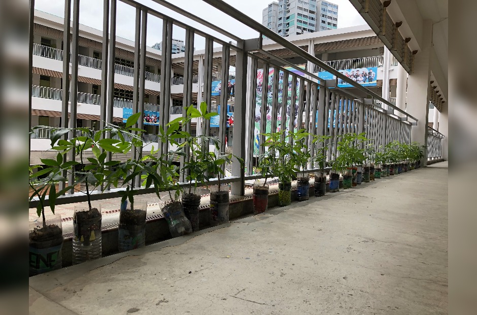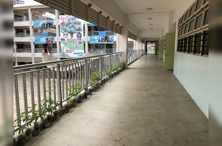Plants in upcycled ‘pots’ line the corridor outside a Sec 1 class in Deyi Secondary.