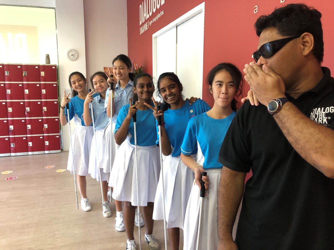 Rakshana (4th from left) with her fellow PSLs participating in a leadership training session conducted at Dialogue In the Dark, a teaching and learning facility in Ngee Ann Polytechnic where participants will experience the life of a visually impaired person. (Photograph taken before 2020.)